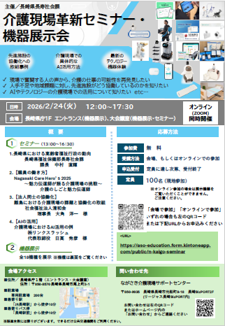 長崎県では、介護従事者の負担軽減や業務の効率化、さらには質の高い介護サービスの提供につなげることを目的として、介護ロボットやICT等の介護テクノロジーの導入促進に取り組んでいます。
